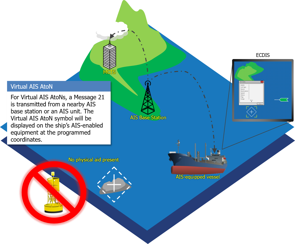 A Virtual AIS AtoN is an AIS Message 21 broadcast from an AIS shore station or an AIS unit installed on another device (e.g., a fixed or floating aid), in situations where there is no physical aid to navigation.