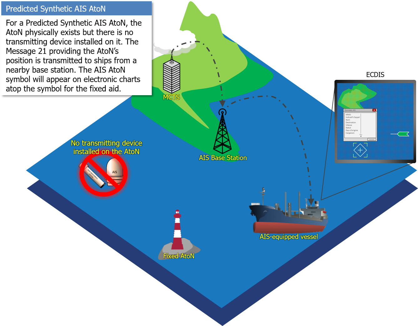 A Predicted Synthetic AIS AtoN is an AIS Message 21 broadcast from an AIS shore station or an AIS unit installed on another device (e.g., a fixed or floating aid). The AtoN on which the AIS Message 21 is broadcast physically exists, but neither the position nor the status are monitored.