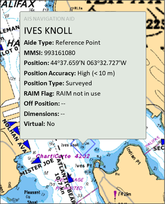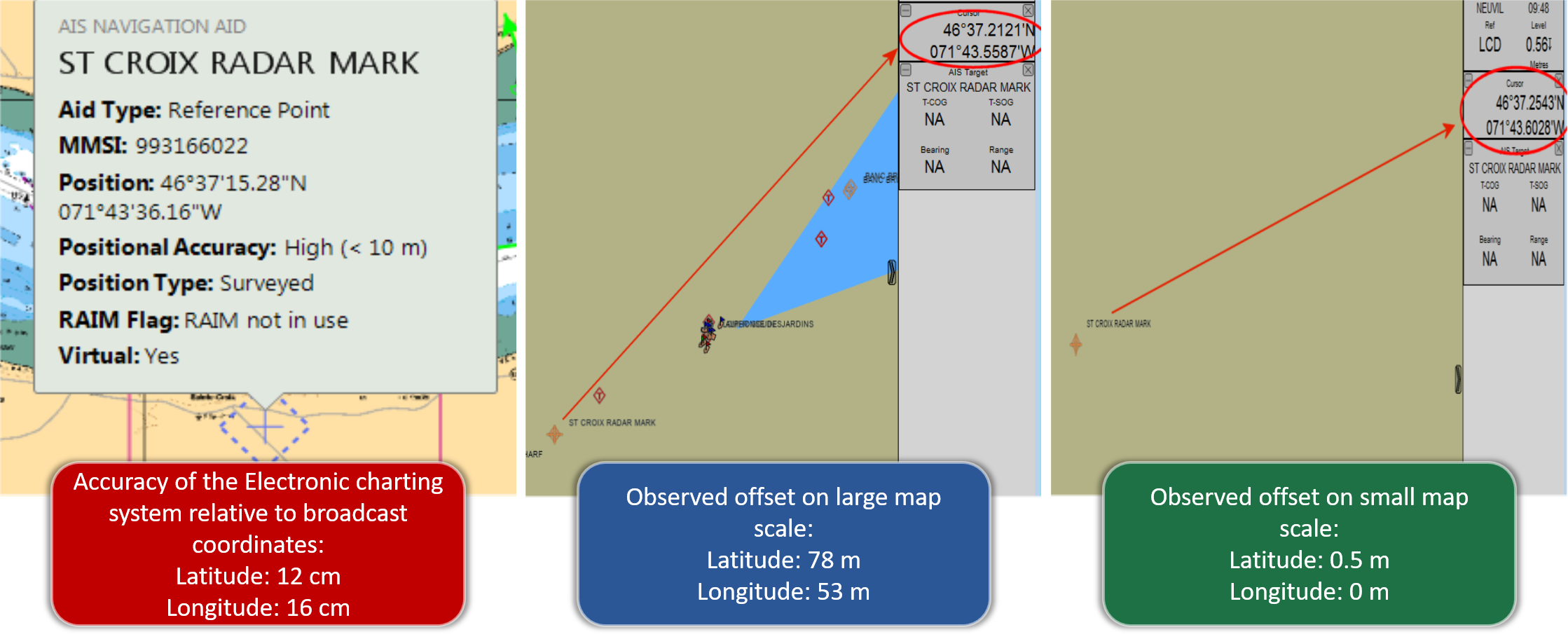 The AIS signal used for Virtual and Predicted Synthetic AtoN is broadcast every three minutes by the Canadian Coast Guard (CCG). Using a surveyed site, the AIS signal has an accuracy of 1/10,000 min in longitude and in latitude, i.e., 18 cm in latitude and 12 cm in longitude (ITU Recommendation M.1371). This high accuracy can be affected by the number of decimals (geographical coordinates) used by the display systems, the scale used, and other factors. Even when considering these elements, it remains that the broadcast regularity and accuracy make it possible to have a good level of confidence in the Virtual and Predicted Synthetic AIS AtoN.