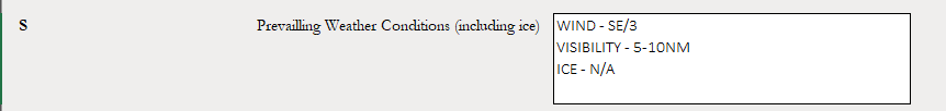 Course, Speed, and Prevailing Weather Conditions, including ice, are to be entered into fields E, F and S respectively.